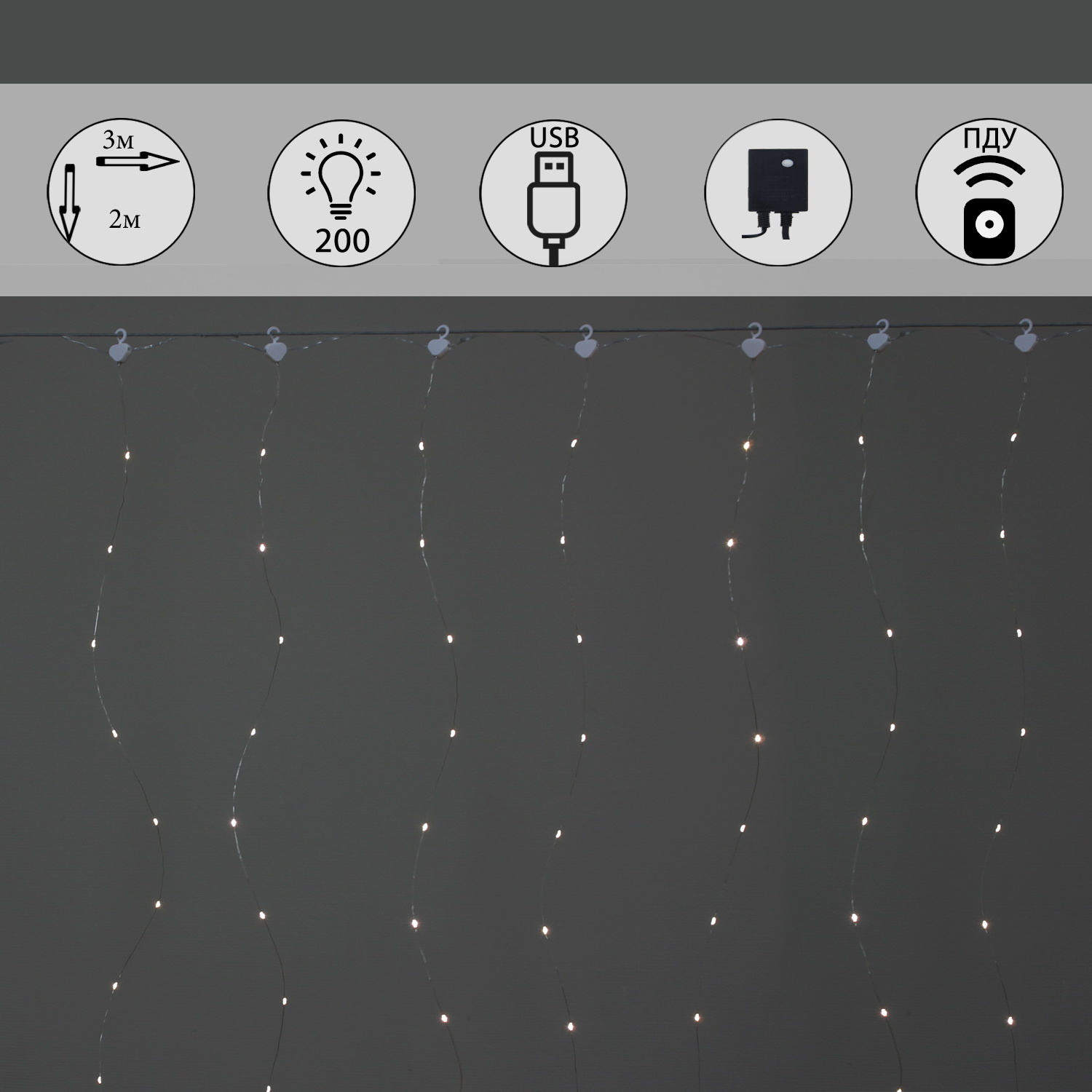 A-973 WW cветовой занавес «Роса», 3х2м, провод серебристый, 200LED, USB-контроллер, ПДУ
