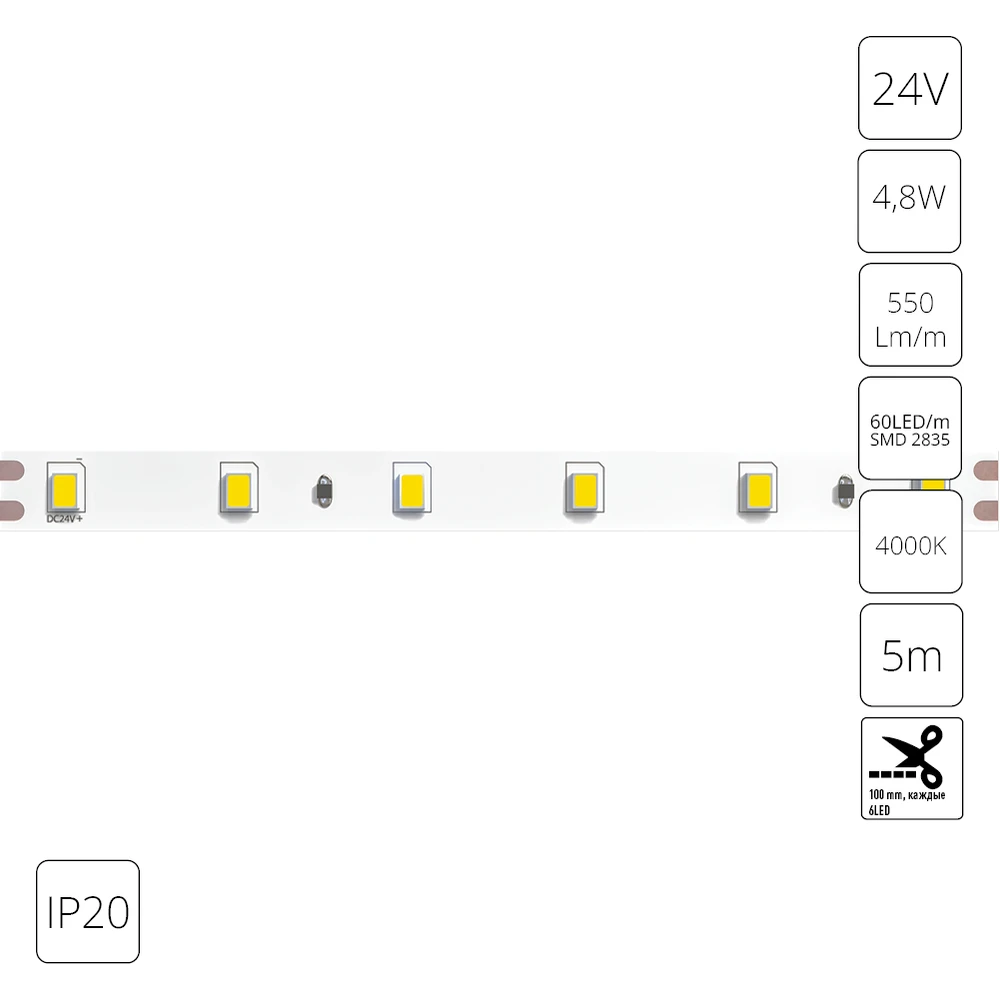 A2406008-02-4K Светодиодная лента 24В 4,8Вт/м 550Лм/м 4000К 90+ 8мм SMD2835 60шт/м 5м IP20