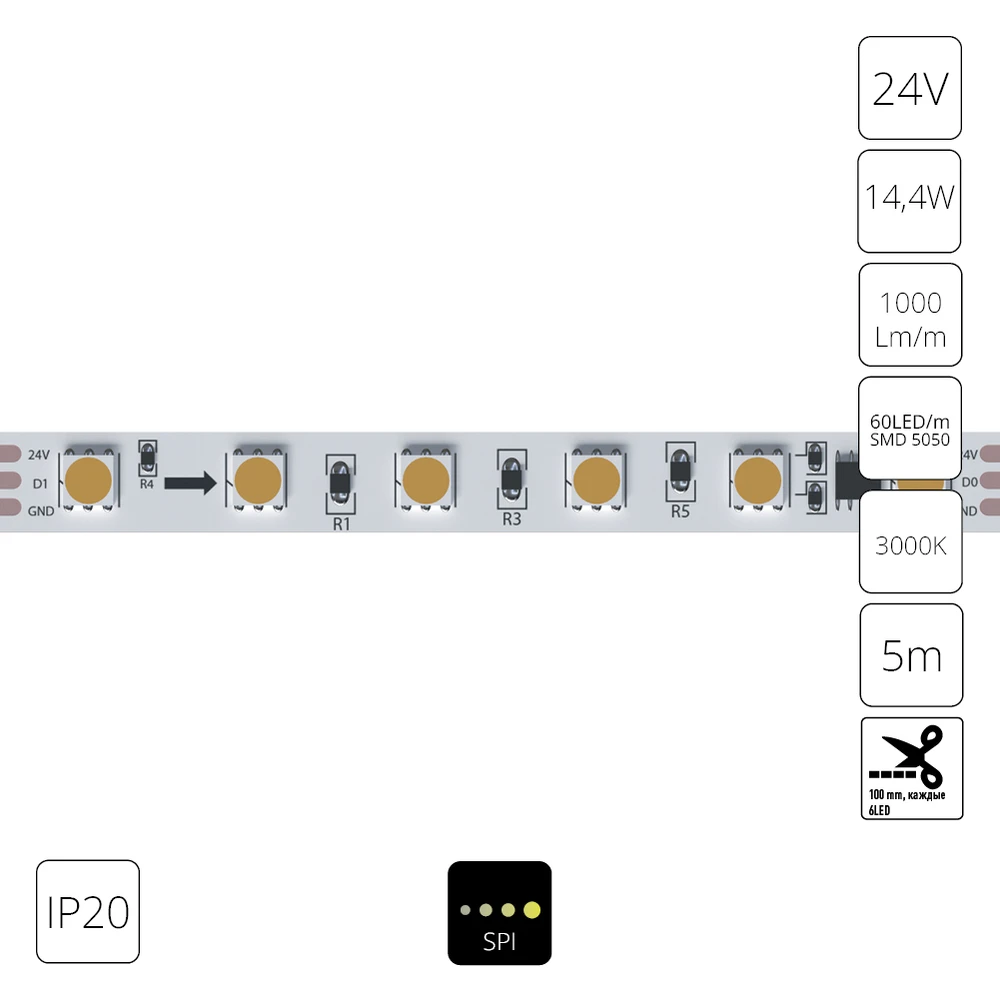 A2406010-03-3K Светодиодная лента SPI 24В 14,4Вт/м 3000К 90+ 10мм SMD5050 60шт/м 5м IP20