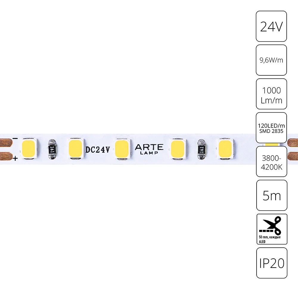Светодиодная лента 24V 9,6W m 4000К 5м Arte Lamp TAPE A2412005-02-4K