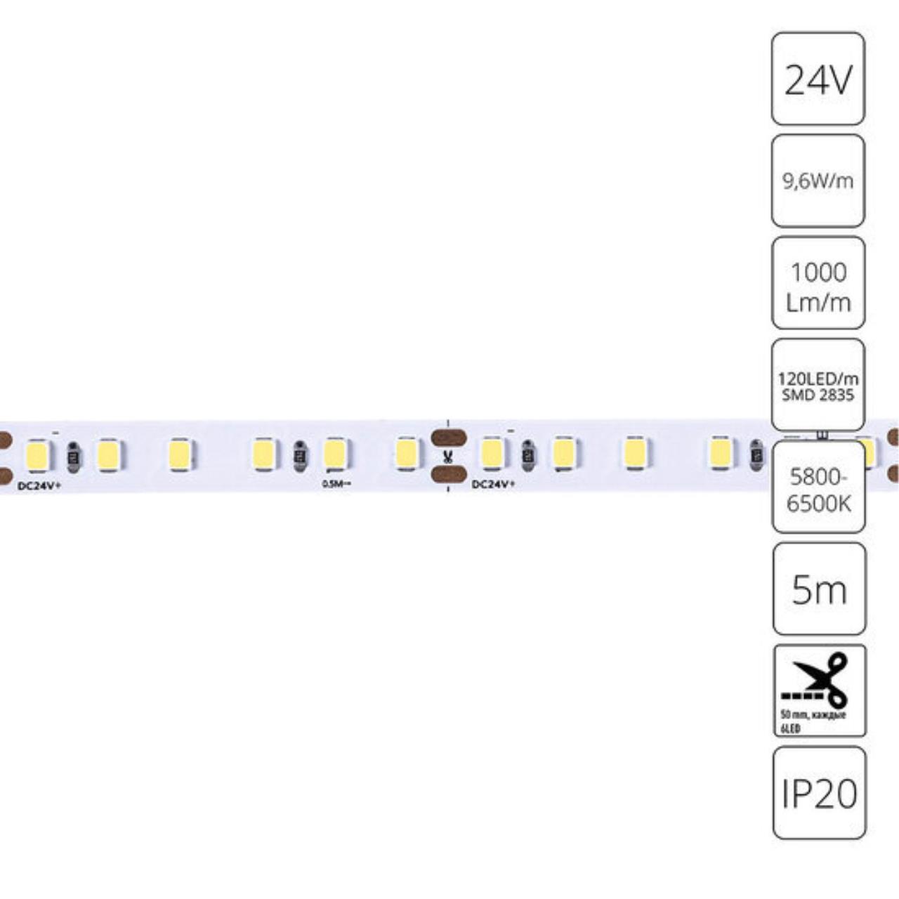 A2412008-03-6K Светодиодная лента 24В 9,6Вт/м 1000Лм/м 6000К 90+ 8мм SMD2835 120шт/м 5м IP20