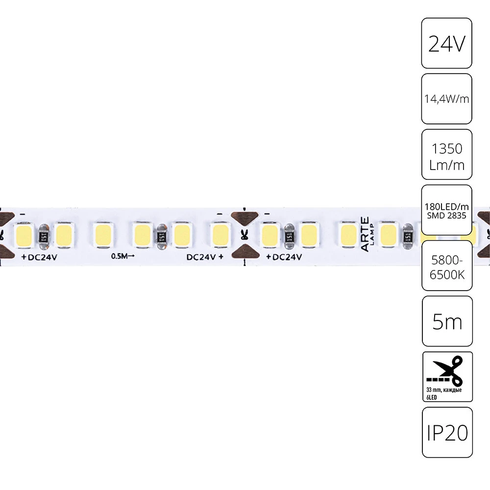 Светодиодная лента 24V 14,4W m 6000К 5м Arte Lamp TAPE A2418008-03-6K