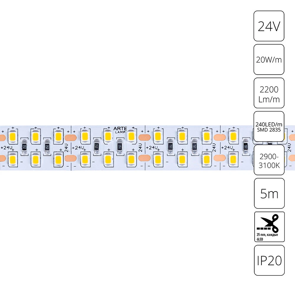 Светодиодная лента 24V 20W m 3000К 5м Arte Lamp TAPE A2424015-01-3K