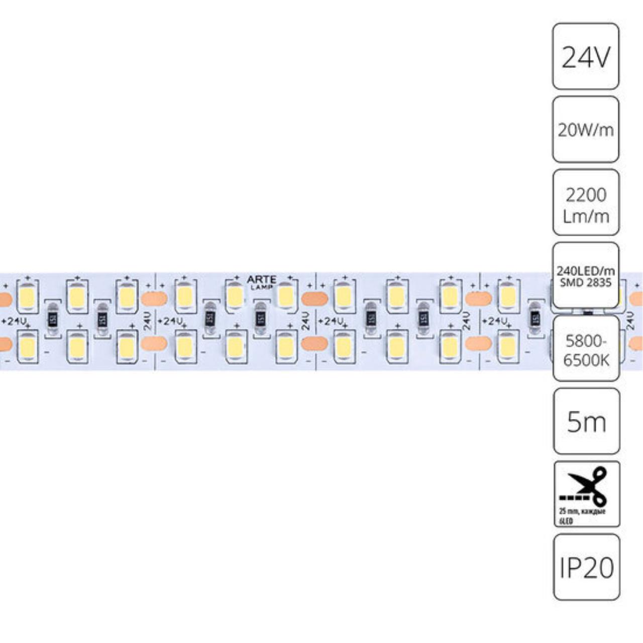 Светодиодная лента 24V 20W/m 6000К 5м Arte Lamp TAPE A2424015-03-6K
