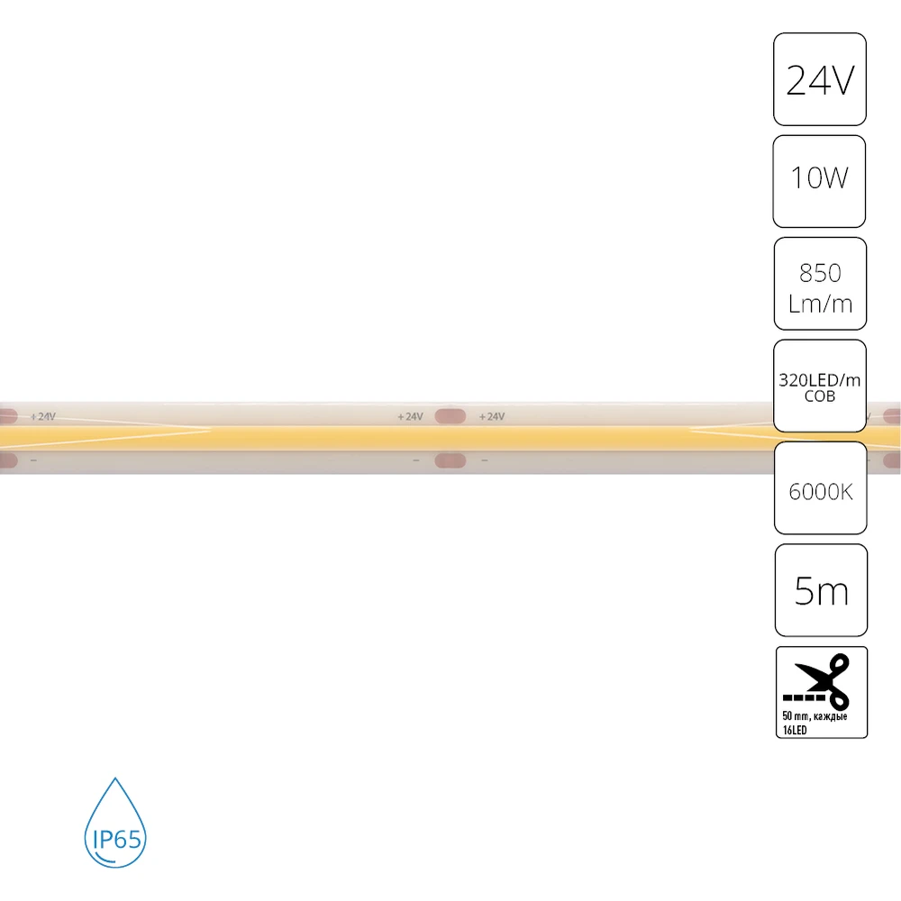 A2432008-06-6K Светодиодная лента 24В 10Вт/м 850Лм/м 6000К 90+ 8мм COB 320шт/м 5м IP65