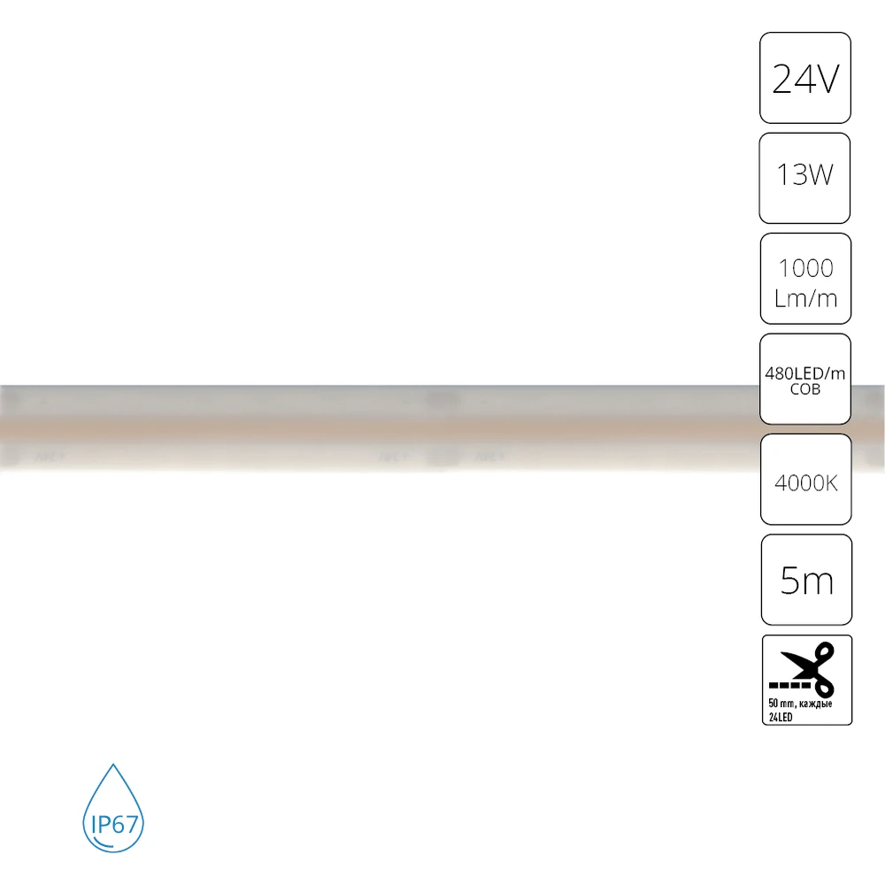 A2448010-02-4K Светодиодная лента 24В 13Вт/м 1000Лм/м 4000К 90+ 10мм COB 480шт/м 5м IP67