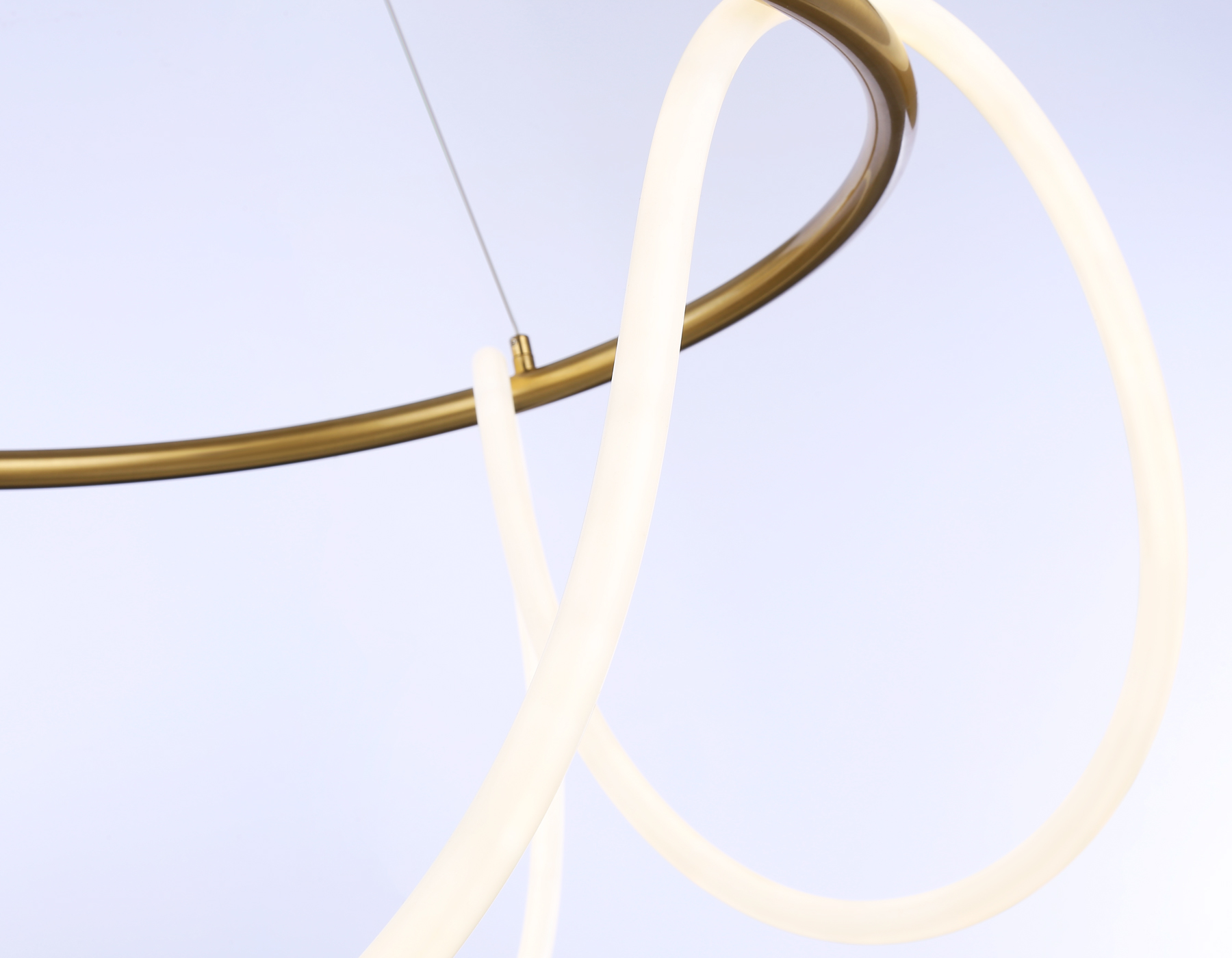 Подвесной светодиодный светильник из коллекции COMFORT. Великолепная модель FL10503 выполнена в современном стиле техно. Эта модель изготовлена из металлического корпуса цвета латунь и силикона. Благодаря встроенным в конструкцию светодиодам, вы можете с уверенностью забыть о поиске или замене дополнительных ламп. С помощью мобильного приложения, а так же радиоуправляемого пульта вы сможете регулировать цветовую температуру, яркость освещения и ночной режим. Эта модель подходит для натяжных потолков и будет прекрасным дополнением в любом помещении.