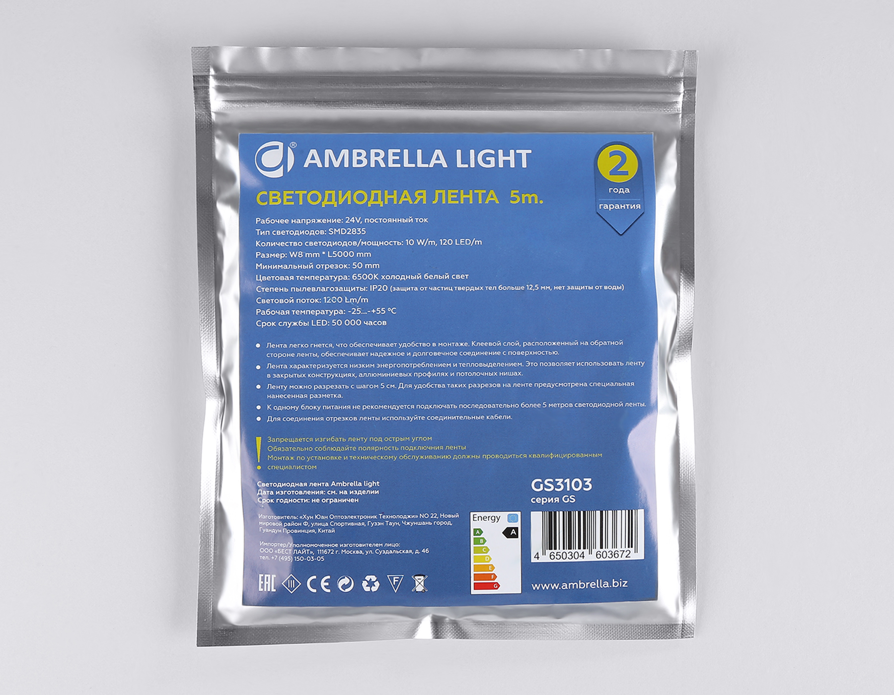 Светодиодная лента Ambrella Light GS3103 2835 120Led /10W m/ 24V IP20 6500K 5m