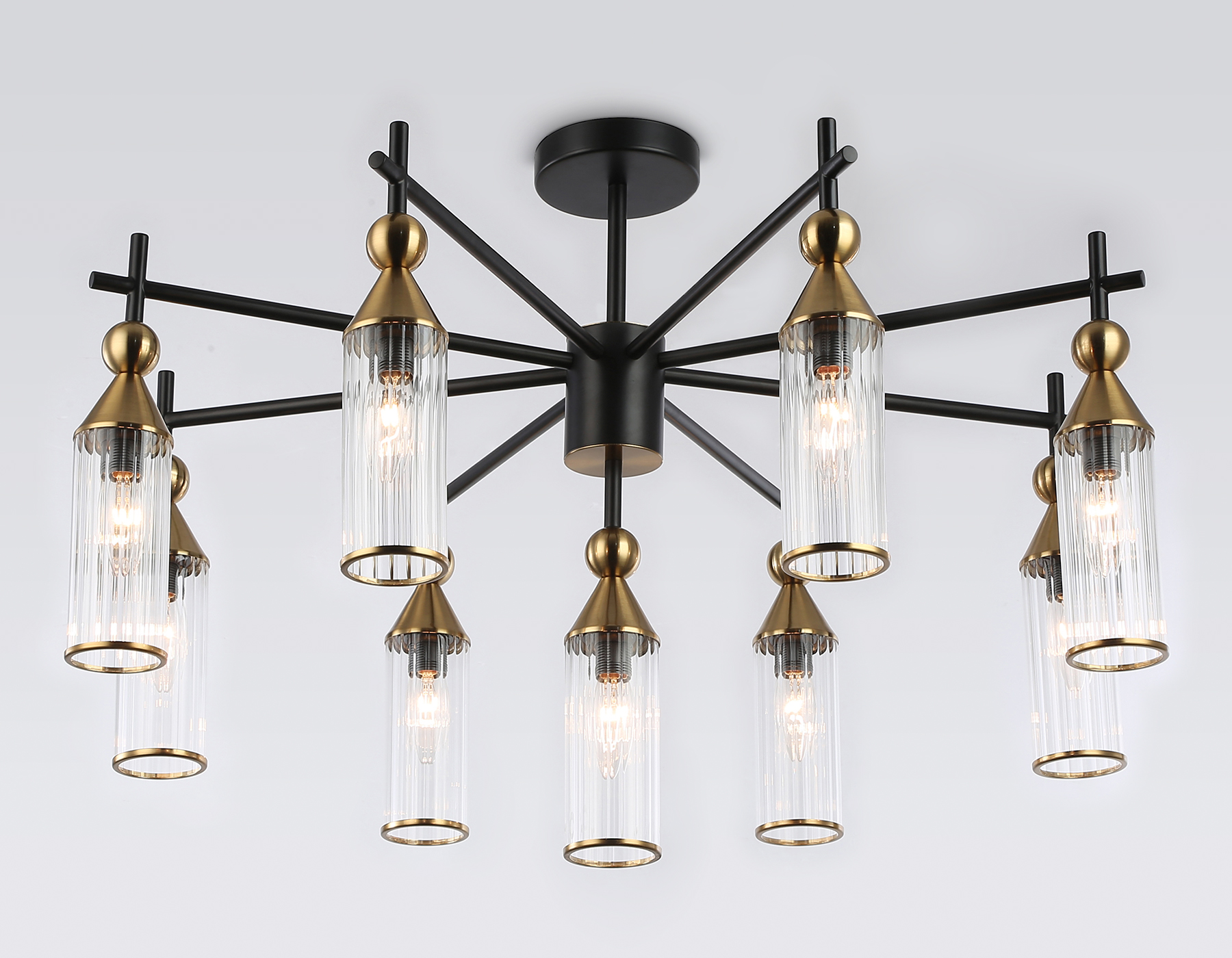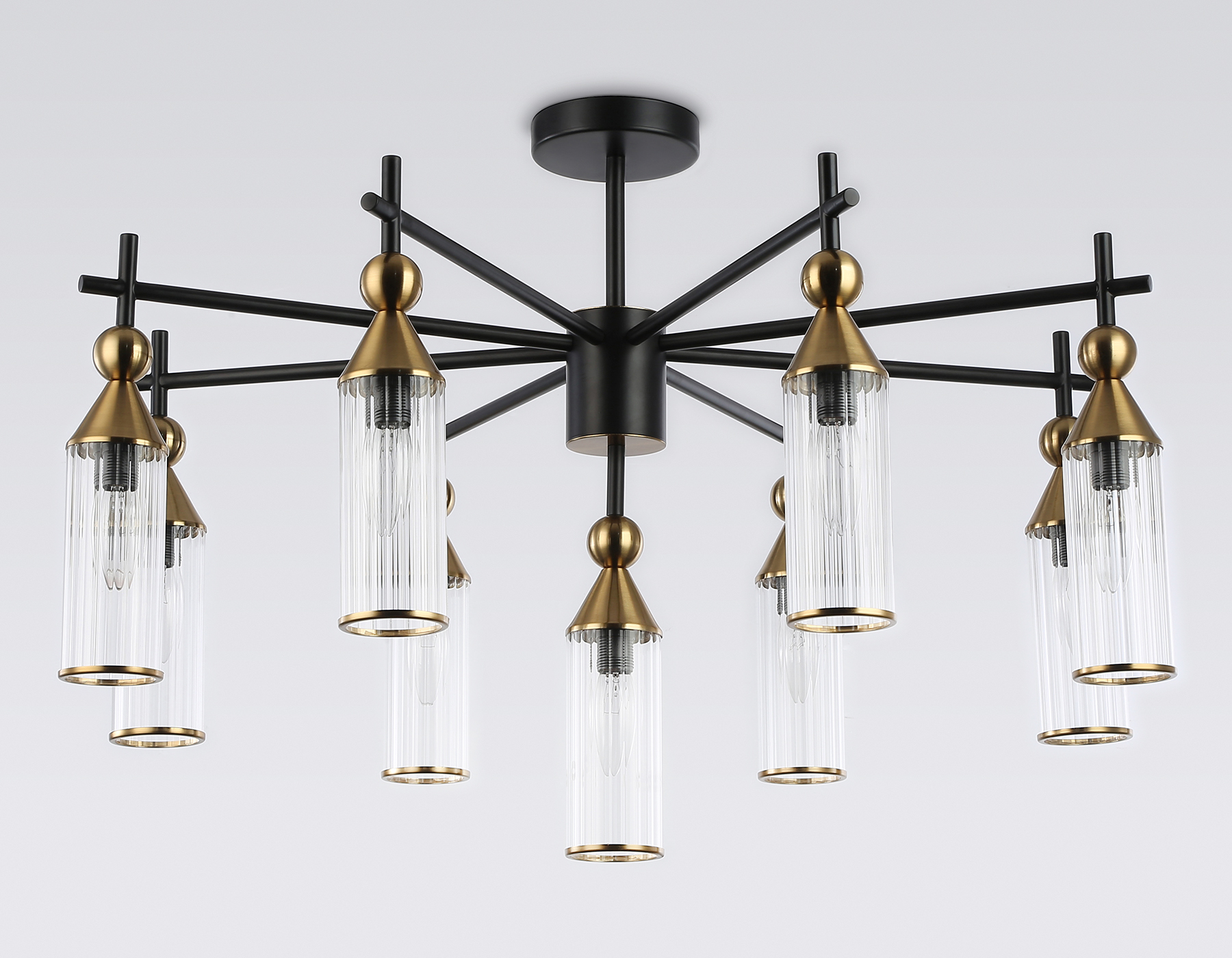 Люстра на штанге из коллекции HIGH LIGHT. Модель LH55258 представлена в стиле модерн. Люстра выполнена из стеклянных прозрачных плафонов, металлического каркаса черного цвета и цвета латунь. Для данной модели подойдут лампы с цоколем Е14. Люстра будет прекрасным дополнением в любом помещении.