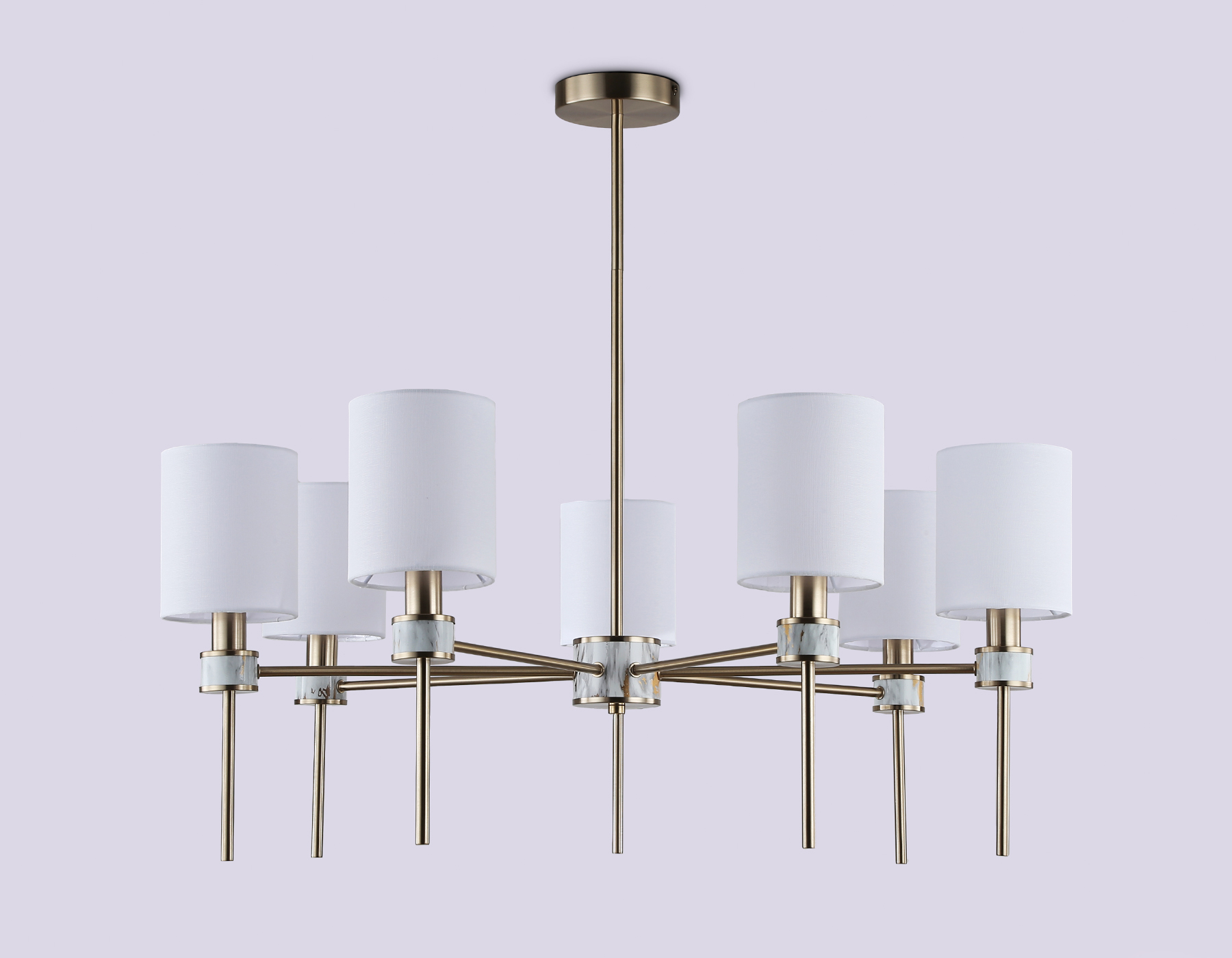 Подвесная люстра с абажурами из коллекции HIGH LIGHT. Модель LH72373 представлена в классическом стиле. Люстра выполнена из тканевых плафонов белого цвета, каркас изготовлен из металла цвета темная латунь. Для данной модели подойдут лампы с цоколем Е14. Люстра будет прекрасным дополнением в любом помещении.