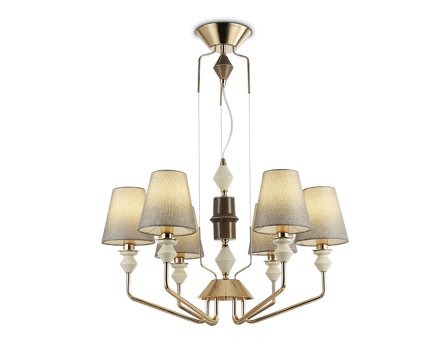 Подвесная люстра с абажурами из коллекции HIGH LIGHT. Модель LH75401 представлена в классическом стиле. Люстра выполнена из тканевых плафонов серого цвета, металлического каркаса цвета «золото» и декорирована элементами из керамики. Для данной модели подойдут лампы с цоколем Е14. Люстра будет прекрасным дополнением в любом помещении.