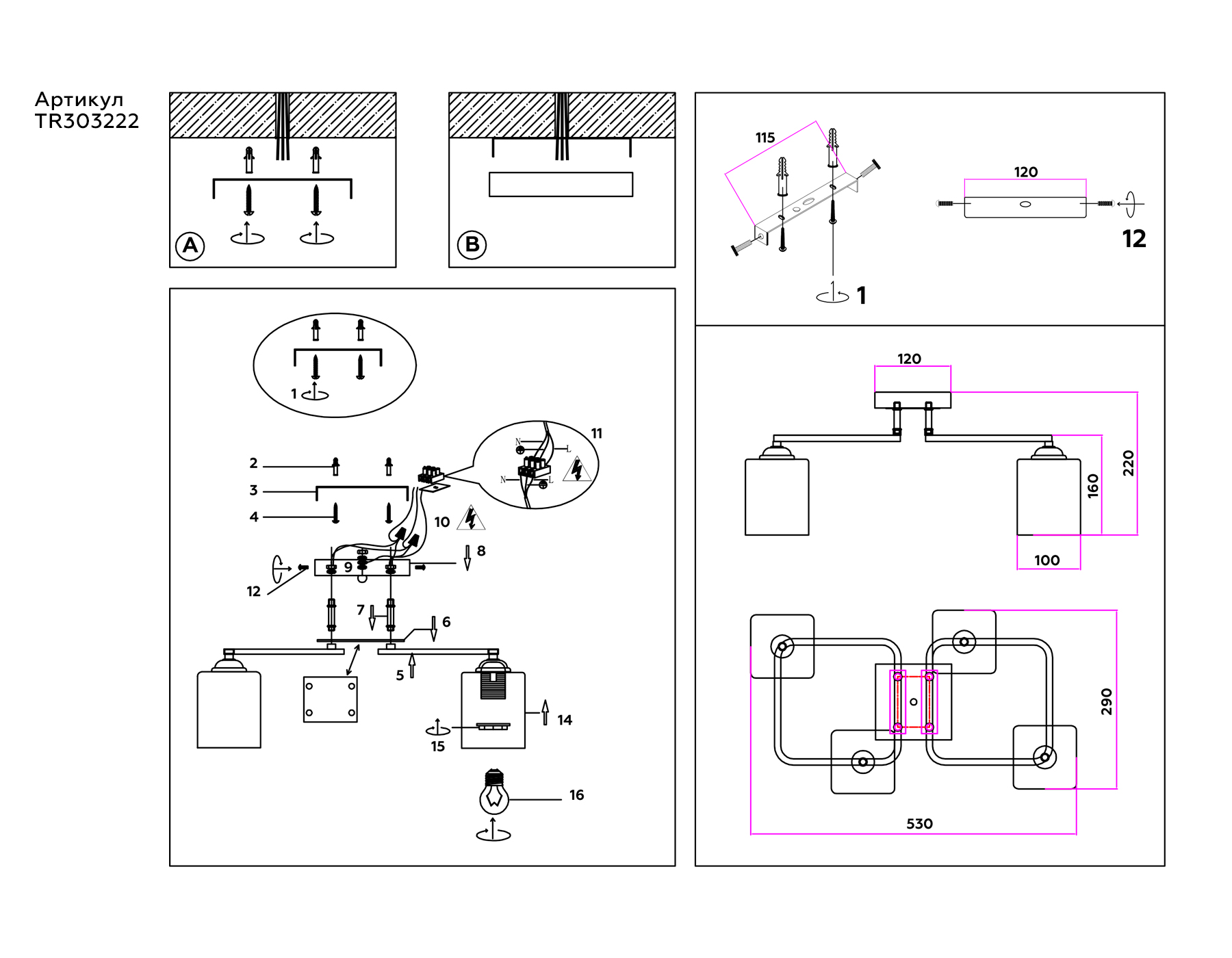 TR303222/4 BK/CH/FR черный/хром/белый матовый E27*4 max 60W 530*290*220
