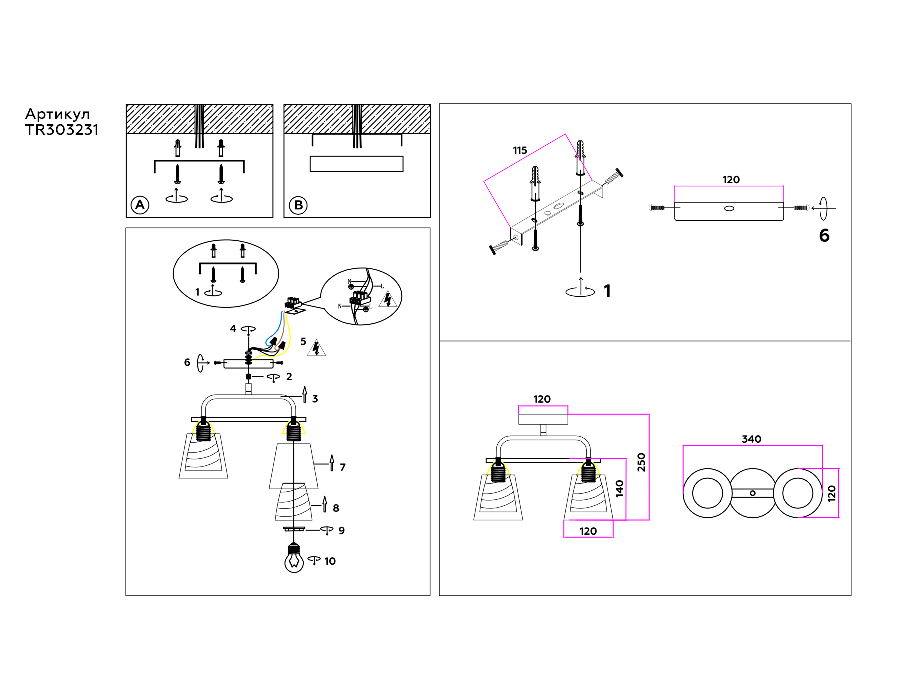 TR303231/2 BK/CH/SM/FR черный/хром/дымчатый/белый матовый E27*2 max 60W 340*120*250